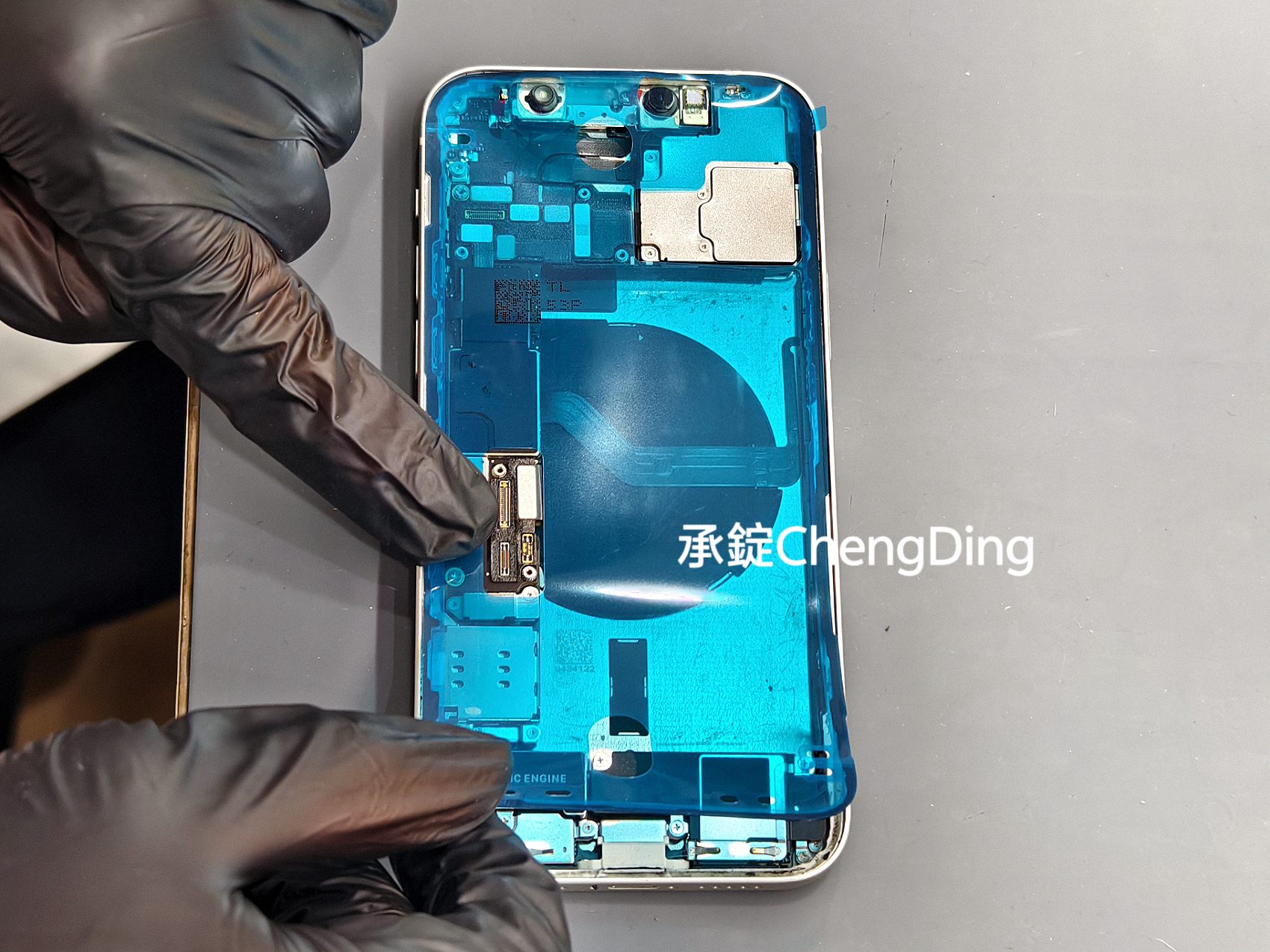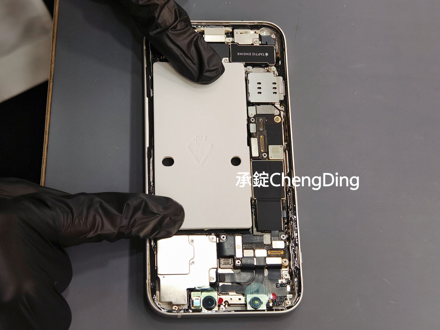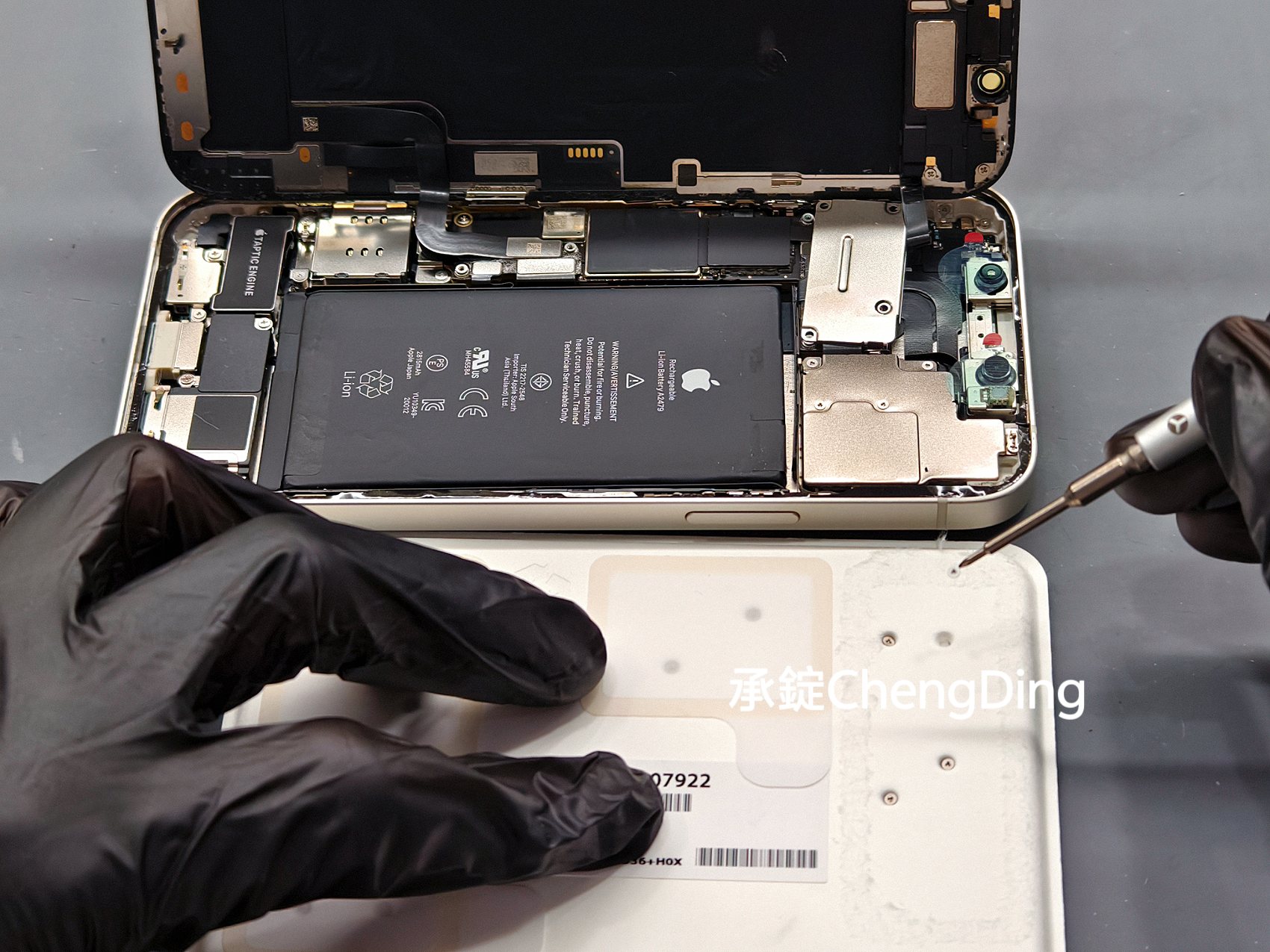 打開iPhone面板後,維修師第一步不是拆電池,而是先貼上Face ID防靜電貼紙。這些小細節其實非常重要,能大幅降低維修過程中,意外損傷零件的風險。