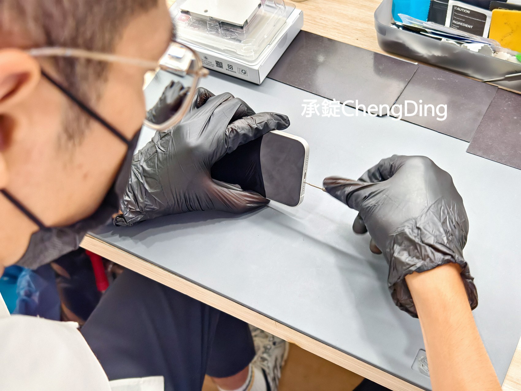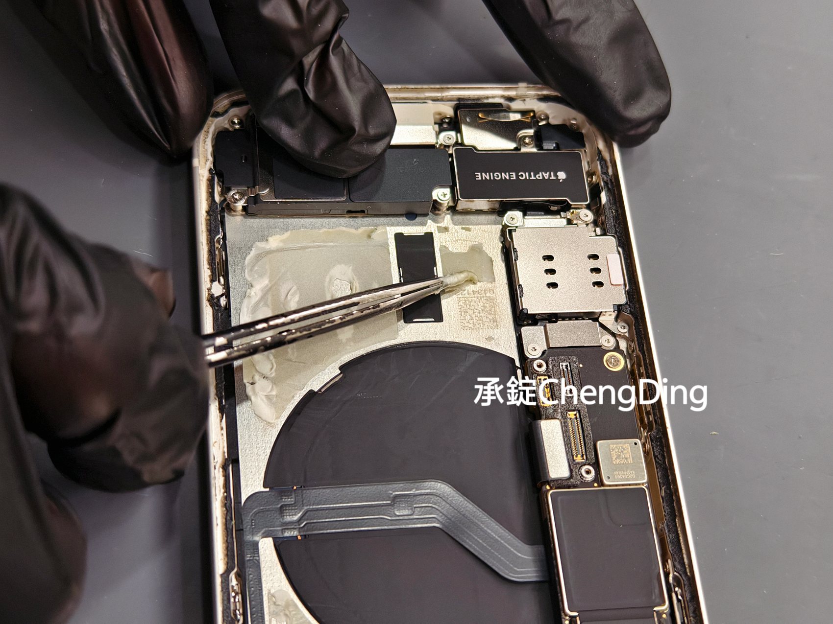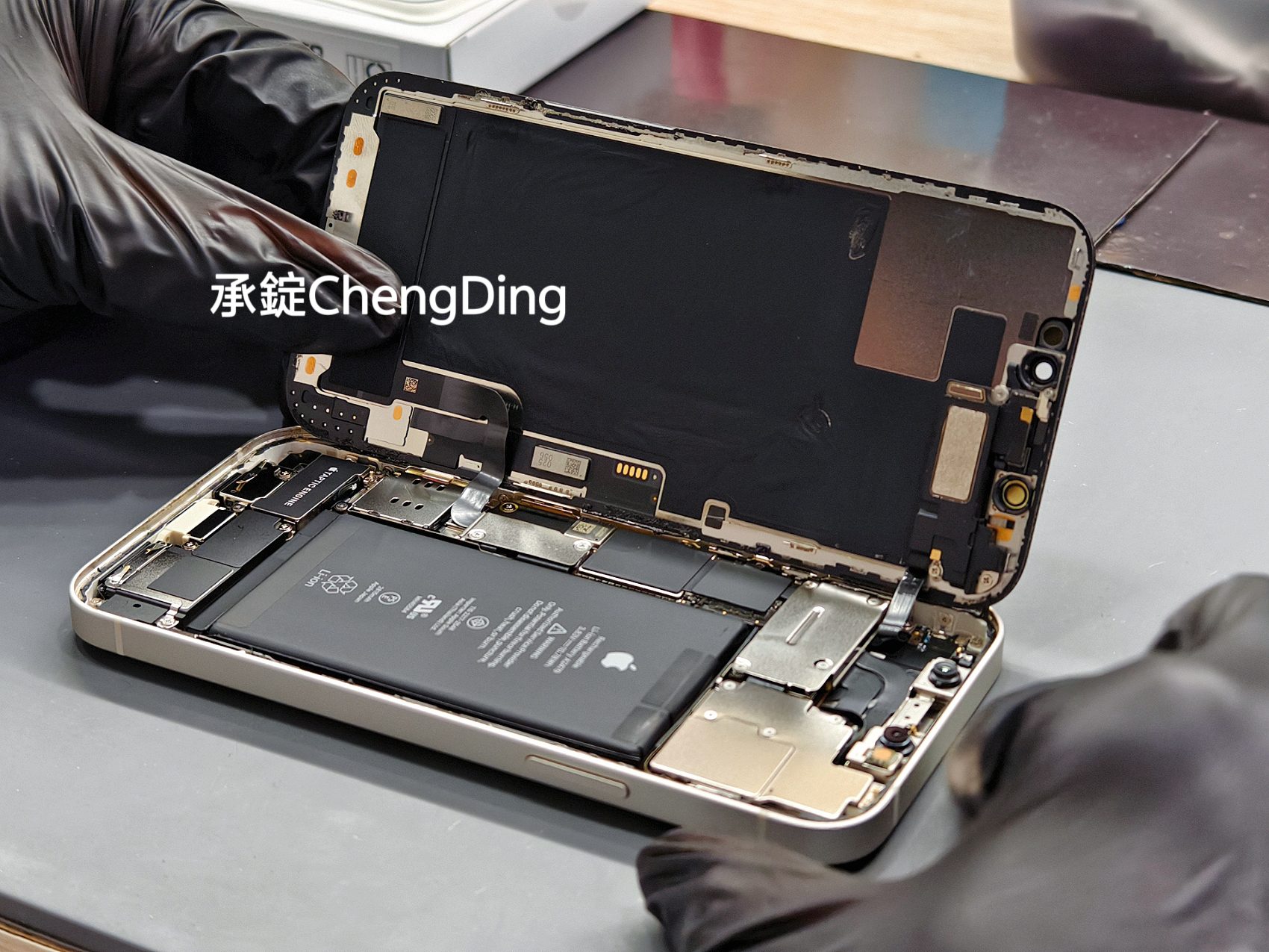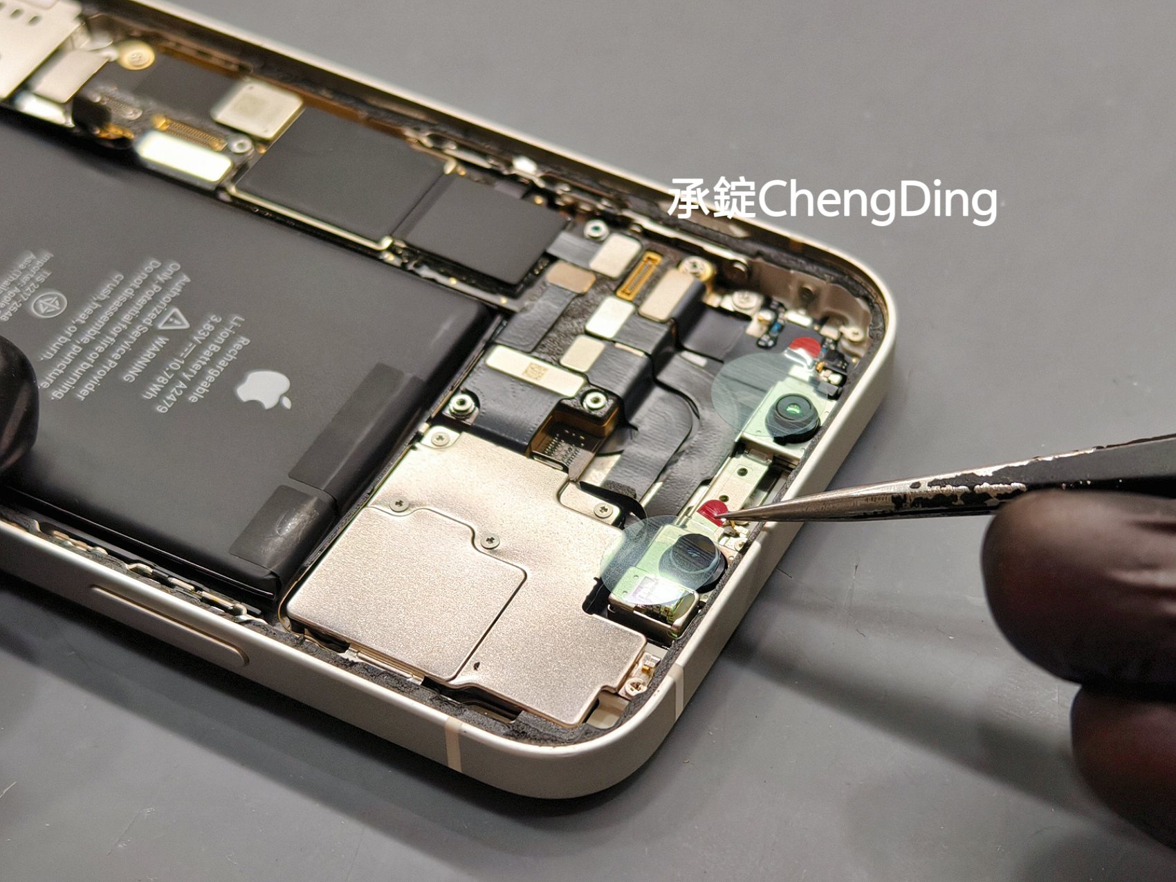 打開iPhone面板後,維修師第一步不是拆電池,而是先貼上Face ID防靜電貼紙。這些小細節其實非常重要,能大幅降低維修過程中,意外損傷零件的風險。