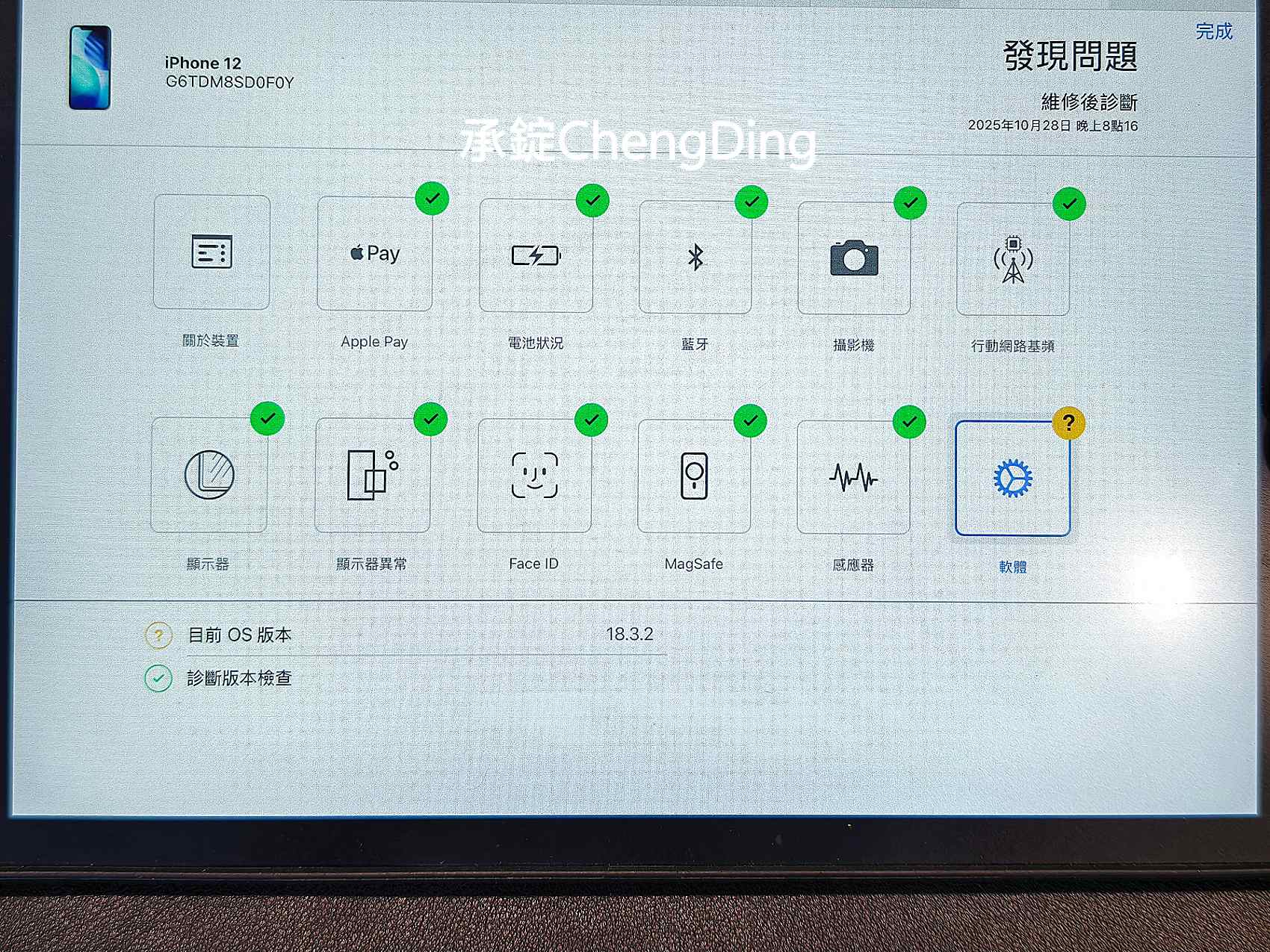 在開始維修前,店家會使用Apple 專用的AST2診斷系統,確認手機主機板、相機、感測器、電池數據等是否正常,多一份確認也更有保障。