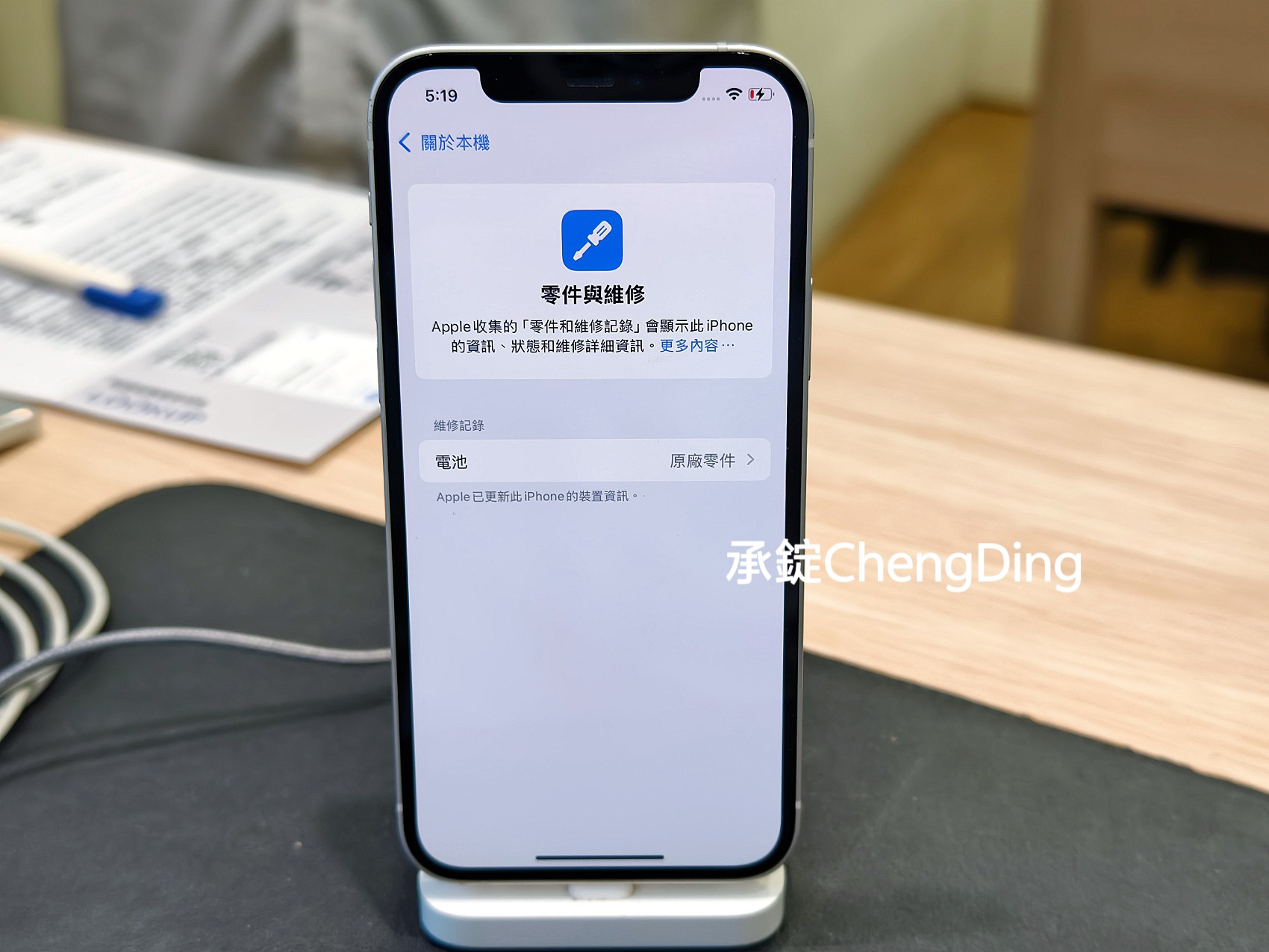 以及「設定>一般>關於本機>零件與維修」,會顯示更換電池為原廠零件。